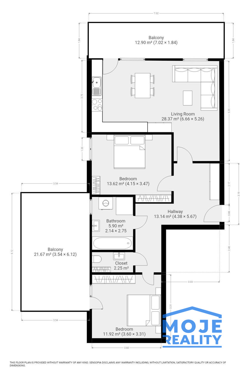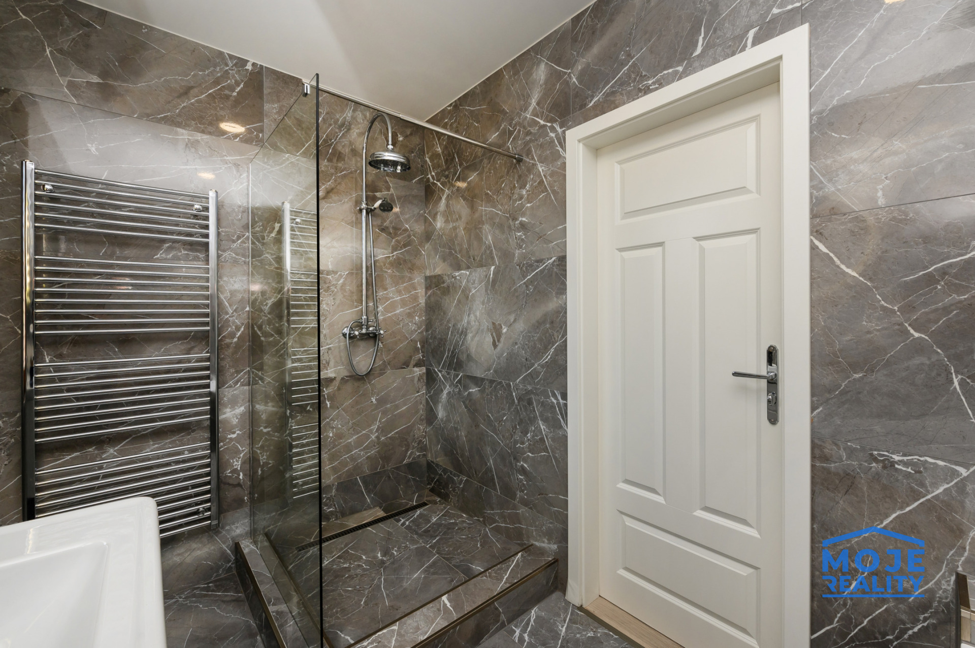 Po vstupu do bytu se ocitnete v prostorné chodbě, ze které je přístup do všech místností. Dvě prostorné ložnice jsou situovány ve středu a po levé straně bytu a vychází se z ní na prostornou terasu o velikosti 22 m2. V pravé části se nachází luxusní koupelna s vanou, sprchovým koutem, umyvadlem a toaletou. V zadní části bytu se nachází prostorný obývací pokoj propojený s jídelním koutem a moderně zařízenou kuchyní. Z obývacího pokoje je přímý vstup na balkon o velikosti 13 m², která nabízí ideální místo pro relaxaci s úchvatným výhledem.