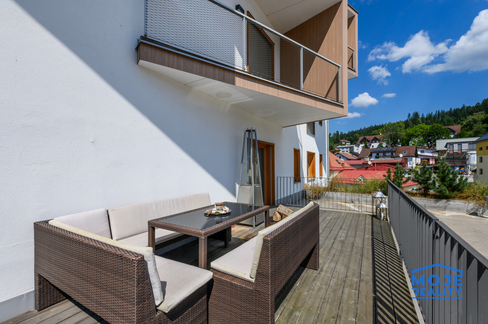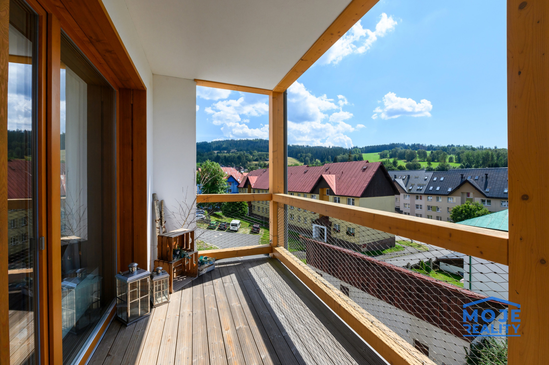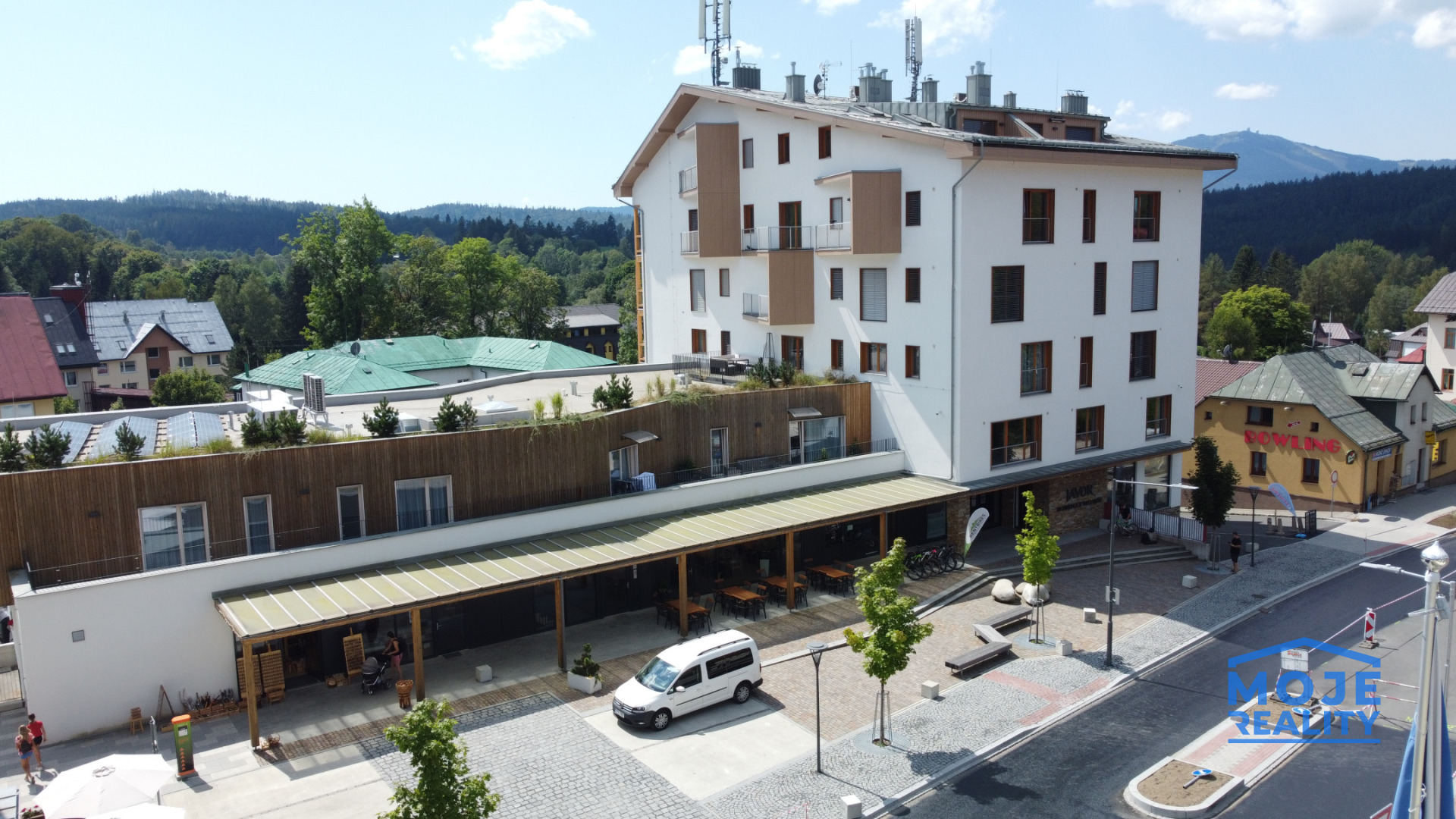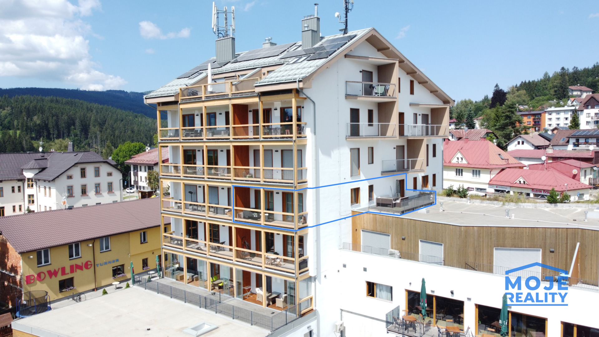 Nabízíme k prodeji luxusní apartmán 3+kk o celkové ploše 118 m², nacházející se ve čtvrtém nadzemním podlaží moderního sedmipodlažního bytového domu, známého jako Rezidence Javor. Tento jedinečný byt, situovaný ve vyšším patře, nabízí nádherný výhled do okolní přírody a je navržen s důrazem na komfort a kvalitu. Jedná se o největší a nejluxusnější byt v celém resortu.